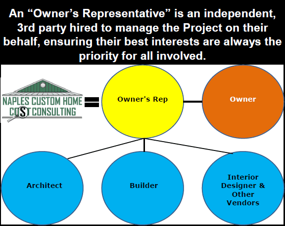 Owner’s Representatives are. They work with the Team, but solely for you, ensuring that your needs for the Project (cost, schedule, quality) are met. With 25 years of first-hand, local experience, Naples Custom Home Cost Consulting offers a full range of Construction Project Management Services to assist Clients, including Owner’s Rep Services that no one else ever has or can. We take every opportunity to create equity by adding value to your home and know how to keep Builders in check without undermining them.